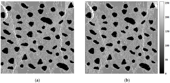 Digital image processing [41,42] was performed on concrete images with different damage degrees obtained in the numerical simulation of concrete damage under uniaxial compression in Section 4.1. In a grayscale image, the brightness of different colors represents a grayscale value, which can be divided into values from 0 to 255. The higher the grayscale value, the lighter the color. Figure 12a is the damage image of 100% concrete ultimate strength calculated by uniaxial compression simulation and Figure 12b is the corresponding grayscale damage image.