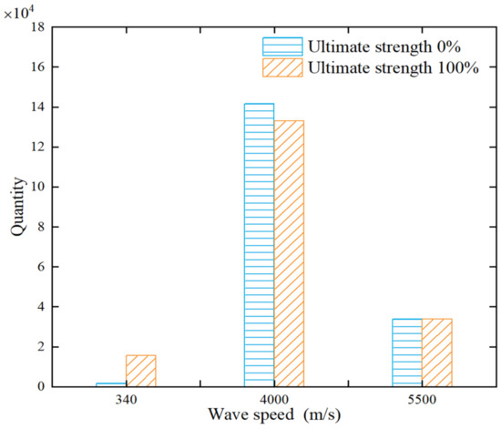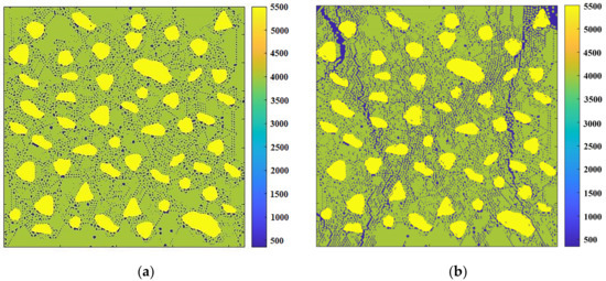 The image is segmented according to the difference in gray value, where gray 0 represents aggregate, gray 255 represents fracture, and other gray values represent mortar. Image units of the same brightness are assigned the same number, and the wave velocity and density are assigned to the corresponding numbered image areas. The actual physical parameters of the different grid materials are assigned in the model; that is, the wave speed of mortar is set to 4000 m/s and the density is 2073 kg/m3; the wave speed of aggregate is set to 5500 m/s and the density is 2760 kg/m3; the wave speed of air is 340 m/s and the density is 1200 kg/m3. After multi-threshold segmentation is performed on the grayscale damage grayscale images of 0% and 100% concrete ultimate strength, the velocity assignment statistics can be obtained, as shown in Figure 13. The concrete numerical model after wave velocity assignment is shown in Figure 14.