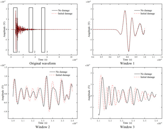 Twenty-four concrete images with different damage degrees were selected to carry out the numerical simulation of the ultrasonic field of the damaged concrete. Since the lateral boundaries of the 2D concrete model are simplified as PML absorption boundaries, the simulated coda signal is very weak. Figure 15 shows the comparison diagram of the ultrasonic signal of the concrete non-damage and the initial damage models; the corresponding load value is about 10% of the maximum load. Comparing the waveforms in time windows 1, 2, and 3, the two waveform signals in window 3 have an obvious phase difference, indicating that the coda wave is very sensitive to the slight changes in the concrete random medium. The waveform signal comparison chart obtained by simulation and experiment showed similar characteristics, which proved the credibility of ultrasonic field simulation.