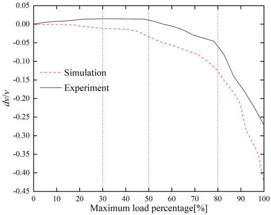 The load percentage is in the range of 30–100%, and the wave velocity change trend of simulation and experiment is roughly the same. However, there is a large difference between the two in the load percentage of 0–30%. The main reason is that the uniaxial compression damage simulation of concrete based on the PFC2D discrete element method cannot simulate the process of concrete compaction during the initial compression stage in the test. Table 6 compares the fitting slope of the wave velocity curve calculated by the simulation with the test results. In the 0–30% interval, as mentioned earlier, the difference between the two is mainly caused by the deficiencies of the simulation calculation software. In the load range of 30–50%, the slope of the two still has a large deviation. However, the curve corresponding to the range of 30–40% tends to be horizontal, and the calculated slope is −0.00821, which conforms to the law of the fitting formula. In the 50–80% and 80–100% sections, the simulation, experiment, and fitting formulas all show a high degree of agreement. In general, the numerical simulation results are consistent with the experimental results, which proves the feasibility of monitoring concrete damage using the fitting formula of the coda wave velocity change rate and the maximum load percentage of concrete under uniaxial compression.