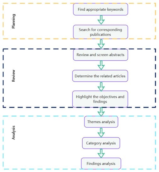The procedure for searching for relevant literature and then reviewing, selecting, and analysing it is depicted in Figure 1. Planning was performed in the central collection of Scopus and WoS using the keywords “naturally occurring retirement community”, “naturally occurring retirement communities”, “NORC”, “NORCs”, “NORC supportive service program”, and “NORC-SSP” appearing in the title, abstract, and keyword section of records. The result of the preliminary search provided an initial number (n = 87) of publications that related to NORCs. The abstracts of the initial results were reviewed to screen for the articles most relevant to the topic. The articles that only mentioned NORCs for comparison with other studies but did not offer substantive conclusions related to the topic were removed. After investigating the abstracts and topics of the 87 articles, a total of 49 articles related to the topic and focused exclusively on NORCs were found, with publication dates from 1900 to 2021. Once the relevant articles were determined (n = 49), we began the time-consuming work of highlighting the objectives, methodologies, and findings of each article, all of which needed to be read in detail and potentially more than once when necessary.