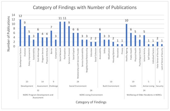 In the data analysis stage, NVivo was used to categorise themes and findings, following a top-down approach associated with three typical content analysis methods, i.e., conventional, directed, and summative, in order to interpret the meaning in the content of the textual data [41]. The criteria used in this paper to categorise the findings of the selected articles align with the thematic classification method. Specifically, the categorisation of findings follows a more detailed approach to analysing the multiple findings, innovations, and discoveries generated by each research project. The results present a review of the research themes and findings consolidated as “NORC Program Development and Assessment”, “NORC Living Environment”, and “Wellbeing of Older Residents in NORCs”, as shown in Table 2.