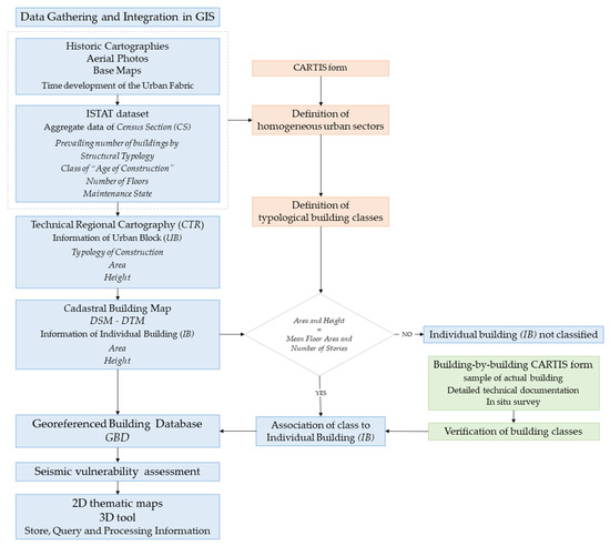 In Figure 1 a flowchart of the procedure is schematized. Data gathering and integration in GIS are carried out by implementing different georeferenced information layers, following a decreasing level of detail: at first, the time development of urban fabric is studied through overlapping historic cartographies, aerial photos, and base maps; then, the analysis of ISTAT information allows for a preliminary subdivision of the urban area. Successively, the definition of homogeneous urban sectors with relative typological building classes is refined by integrating the information derived by CARTIS procedure. All obtained data are associated and added to those already available at the level of UB, down to the level of IB. For the latter, it is also possible recognize the relative CARTIS typological class by means of proper matching of geometrical data. The reliability and accuracy of this classification is verified by means of building-by-building surveys on a sample of buildings. All obtained data are stored in GBD, allowing for the implementation of several types of seismic vulnerability assessment procedures. As a final step, it is possible to plot 2D thematic maps and implement a 3D tool useful for storage, making queries, and processing information and results. The structure and the phases of the procedure are illustrated more in detail in the following sections.