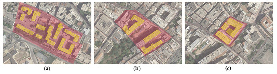 A homogeneous urban sector is a part of a municipality characterized by consistency in building fabric, the same age of first construction, and the same prevalent structural and typological features [40]. The definition of different homogeneous parts of a municipality can be carried out on the basis of the information contained in the GBD. The overlap of different historical cartographies allows for the preliminary analysis of the historical development of the urban territory. Then, using the information associated with each CS by ISTAT datasets, it is possible to analyze the distribution of features such as the structural materials, age of construction, number of floors, and maintenance state for the CS of the whole municipality, obtaining a reliable delimitation of the homogeneous urban sectors and the relative aggregate data. For each homogeneous urban sector, a preliminary identification of typological structural building classes is performed on the basis of this elaborated information. Then, a more detailed characterization of the typological classes is carried out by compiling the CARTIS forms with the information about recurrent geometrical, structural, and morphological features supplied by the local expert technicians. Consequently, these data are associated with each IB by matching area and height derived by the Cadastral Building Map and DTM and DSM, with the geometrical data about mean floor area and number of stories contained in Section 2 of the CARTIS form, recognizing the corresponding typological class and the pertinent Cartis typological and structural information.