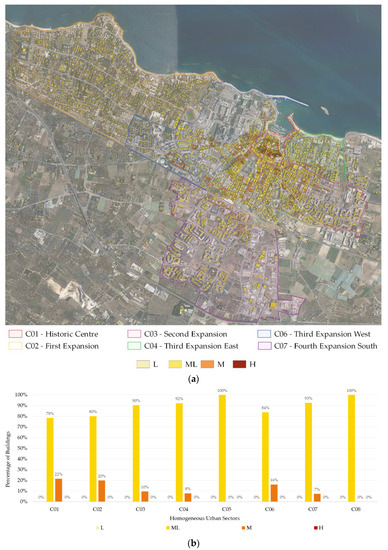 The procedure follows a top-down approach, using all available datasets with different levels of detail. An application has been developed for a case study in Puglia, Italy, the City of Bisceglie. The analysis of the urban area is performed on the basis of historic cartography and ISTAT statistical data [2], providing a preliminary definition of homogeneous urban sectors. In each of these urban sectors, the recurrent geometrical, structural, and technological features of buildings are identified using more detailed georeferenced datasets and the CARTIS procedure [40], and different typological building classes representative of the entire building stock are defined. For validating the database, a phase of verification of the features of some typological building classes is made by analyzing a sample of buildings for which detailed information is available. Finally, on the whole database for the examined urban areas, a simplified version of the procedure proposed in [65,66] is applied, and the seismic vulnerability assessment for 3726 individual buildings and a 3D interactive tool is released for the visualization of data and results.