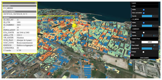 where is the typological seismic vulnerability index proposed in [66,67] and represents the modifying coefficients depending on different factors. The values of and vary according to the structural material and other parameters; in any case, the result in terms of the seismic vulnerability index must be between −0.02, corresponding to the maximum seismic vulnerability, and 1.02, corresponding to the minimum seismic vulnerability. As reported in Table 2, the value of for masonry buildings depends on classes based on the age of construction, assuming a decreasing value for newer buildings. In Table 3, the values of for reinforced concrete buildings are reported; they decrease according to three seismic design level categories: absent; low; and medium. In this case, some assumptions need to be made about the data concerning the age of construction with the evolution of technical standards and Italian seismic classification. Modifying coefficients take into account the contribution of other features that influence the seismic behavior listed in Table 4 and Table 5, respectively, for masonry buildings and reinforced concrete buildings with reference to the classes previously defined: in both cases, the parameters considered are the state of maintenance and the number of floors. In addition, for the masonry buildings, the position in aggregate is evaluated; hence, according to this approach, a negative value of is associated with a worse condition and a positive value of with a better condition. The results, together with all information, are stored in the GBD as attributes associated with corresponding ME. In this way, it is possible to elaborate interactive 2D and 3D maps of the city within the GIS environment.