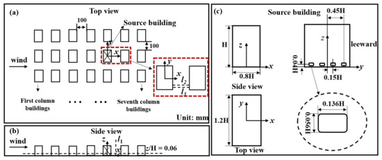 (a) The top view of building model and measurement lines of concentration distribution: (b) The side view of building model and measurement line of wind field; (c) locations and dimensions of the sources.