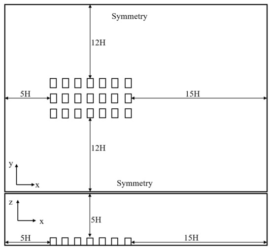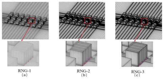 The computational domain size was 30.4 H × 30 H × 6 H (in Figure 3). There were 5 H from the top boundary of the computational domain to the top of the building model, and 12 H from the lateral boundary of the computational domain to the periphery wall surface of the building array, which satisfied the requirement that the blockage ratio should be less than 3% as recommended in reference [42]. The computational domain was meshed using three different resolutions, namely coarse, medium and fine. The dimensionless minimal grid sizes (the ratio of the minimum near-wall grid size to the building height) were 0.016, 0.008 and 0.004, respectively. The expansion ratio between two consecutive cells was 1.18. Figure 4 shows three sets of total mesh numbers, namely 4.16 million (case RNG-1), 7.14 million (case RNG-2) and 11.08 million (case RNG-3). The non-dimensional wall distances y+ of the first near-wall cells were 10, 5.1 and 2.7, respectively.