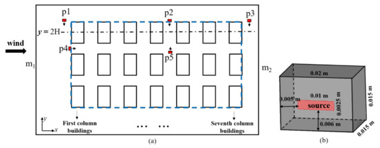Taking Shanghai as an example, the locations of waste bins in residential areas should be arranged in a way that they are convenient to the residents [43]. In a typical residential area of Shanghai, the waste collection point is located at the corner of the building array’s periphery, the middle of the array’s periphery and between two adjacent buildings in the center of the building array. The wind tunnel experiment model was used to represent an ideal residential building array configuration. The locations of the waste collection points relative to the building array are shown in Figure 5a: The corner of the building array’s periphery (p1: windward side, p3: leeward side), the middle of the array’s periphery (p2: lateral side, p4: windward side) and between two adjacent buildings in the center of building array (p5). The size of the waste collection point was 4 m (L1) × 3 m (W1) × 3 m (H1), which was simplified to a cube using the same scale of 1:200 as the wind tunnel test model. Pollutants were emitted from a rectangular surface source of 0.01 m × 0.0025 m, located on a facade of the collection point. Arrows in Figure 2a indicate towards which directions the pollutants were emitted, and Figure 2b shows where the surface source was located on the facade. In this study, H2S was used as the tracer gas. The emission rate of H2S in a landfill in summer was 4–7 μg/(m2·s) [44], which was affected by waste volume, temperature, ventilation and other factors. Taking the correction coefficient of 50%, the emission rate of H2S in the residential area was 2–3.5 μg/(m2·s). In this study, 3 μg/(m2·s) was used for subsequent simulation.