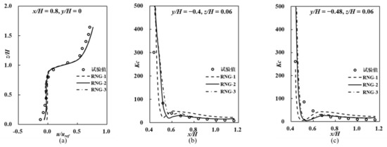 Figure 6a shows the mean velocity distribution on the measurement line l1 along the x direction. The simulation results of the three cases with different mesh numbers are similar and all have a high degree of agreement with the experimental data (EXP) [41]. Figure 6b,c compare the simulated data of pollutant concentration distribution on the measurement lines l2 and l3 with the experimental data at the three different grid resolutions. Figure 6b shows that the simulation results of the case RNG-2 and the case RNG-3 are closer to the experimental data. It is worth noting that in the wake region of the building in Figure 6c, x/H = 0.5~0.6, the simulated results are lower than the experimental results [41]. Due to defects in the RNG k-ε model, the pollutant concentrations in the wake zone are underestimated. In general, the simulated results at most locations are more consistent with the experimental data. Therefore, it can be considered that the turbulence model and the numerical method are suitable for the prediction of the diffusion of odor in residential areas. Considering the calculation time and simulation accuracy, the mesh numbers of the following cases are drawn using the meshes of the case RNG-2.