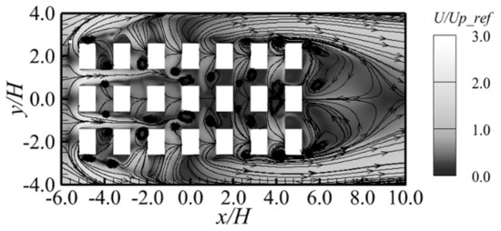 Figure 7 shows the mean flow field around the residential building array in the X–Y plane. The dimensionless wind speed is the ratio of mean wind speed at pedestrian-level height in the residential area to the wind speed at the same height of the inflow wind. The mean flow field can be divided into low wind speed zone (dark gray, 0.0–1.0), medium wind speed zone (medium gray, 1.0–2.0) and high wind speed zone (light gray, 2.0–3.0). As can be seen from Figure 7, the flow separates upwind to the first column of buildings due to the obstruction of the buildings, and a high wind speed zone appears at this position. The presence of buildings in the residential area led to a gradual decrease in the wind speeds. The medium wind speed zone appears on the leeward side of the first four columns of buildings and the periphery of the building array, while the low wind speed zone appears around the last three columns of buildings. At the same time, there is an obvious wake region at the leeward side of the building array, and when x/H exceeds 8, the effect of the recirculating area is weakened.