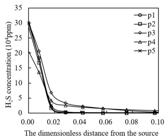 Figure 8 shows the H2S dispersion profiles normal to the surface sources at pedestrian-level height. The distance from the garbage source is made dimensionless by the building height. A sharp decrease in the H2S concentration within the dimensionless distance of 0.02 is observed for each profile, indicating that the natural wind can quickly dilute the pollutant released at each source location. Especially for the profiles of p1, p2 and p5, the concentrations drop to nearly zero ppm around the dimensionless distance of 0.02.