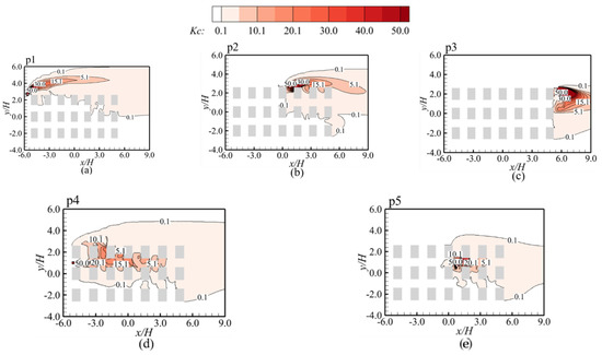 Figure 9 shows the distributions of H2S concentration at z/H = 0.06 when the waste collection point is at different locations. As can be seen from Figure 9, when the source is located at p1, the average dimensionless concentration Kc is less than 5 in the residential area, and the area is not fully covered by high-concentration H2S. This is because p1 is located in the windward side of the corner of the building array’s periphery, where the wind speed is higher and almost unobstructed by the buildings, and the pollutants can be quickly blown to the periphery of the building array by the natural wind. The source at p3 is in the wake region of the building array (Figure 7), and the pollutants tend to accumulate on the leeward side of the adjacent building with low wind speed, which makes the upstream buildings almost unaffected by it.