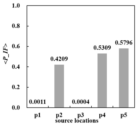 Figure 10 shows the average personal intake fraction <P_IF> at pedestrian-level height when the source is at different locations. When the source is located at p1 and p3, the <P_IF> is lower, only in the range of 10−3–10−4, which is consistent with the results of lower concentration of H2S in the residential area in Figure 9a,c. It can be explained as shown in reference [15] that these two locations are located in the separation area and the recirculation area behind the building, and the pollutants mainly exist at the side of the building and near the leeward wall behind the building. Therefore, the pollutant concentration in the residential area is low, while the <P_IF> values of p2, p4 and p5 are in the same order of magnitude and three orders of magnitude higher than the other two locations. The <P_IF> value of p2 is slightly lower than that of p4 and p5, which is caused by the diffusion of some of the pollutants produced by p2 out of the residential area (Figure 9). In the case of p4, the source location is upwind of the building array and the area affected by the pollutant is broader than p5. In the case of p5, the source location is in the center of the building array and its influence is restricted to downwind of the center. However, the <P_IF> value in p4 is lower than p5. The natural wind can quickly disperse the pollutants from p4, but in the case of p5, the pollutant released by p5 is dispersed by the natural wind after it infiltrates into the building array. The natural wind dissipates during the infiltration, causing the pollutant released at p5 to accumulate and resulting in a high <P_IF> value in the residential area. This phenomenon agrees with the reported result [47] that the upwind source location leads to a lower <P_IF>. In addition, the previous study [47] measures the <P_IF> locally within the space between the nearest two buildings, and the present study shows that the upwind source location also results in a lower <P_IF> value for the entire residential area compared to the source location in the center of the residential area. In order to reduce the exposure risk of residents to the odor, it is recommended to avoid arranging the waste collection point in the center of the residential area but to arrange the waste collection point at the area’s periphery, especially at the corners.