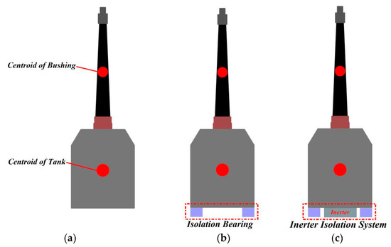 Lifeline structures have high vulnerability under earthquakes [1], such as transformer–bushing systems [2]. The main reason is that the natural vibration frequency of the structure is close to the predominant frequency of external excitation [3], resulting in the amplification of vibration response [4]; therefore, vibration mitigation and control in the structure is particularly important. Many researchers have noticed that isolation technology can effectively reduce the base shear force at the bottom of the transformer and reduce the displacement response of tank, bushing and auxiliary facilities [5], so as to protect the transformer from various disasters in strong earthquakes. Fujita et al. [6,7] carried out a test analysis of laminated rubber isolation bearings for transformers and other large gravity equipment, focusing on the development of isolation devices and verifying vibration control effect, without considering the interaction between transformers and bushings. Thu Pham [8] carried out a shaking table test of transformer–bushing. During the test, a vibration isolation device composed of steel cable was installed between the transformer frame and bushing, and a viscous damping system was set under the transformer frame to transformer oil. The test showed that the vibration isolation device has the vibration isolation effect of significantly reducing the acceleration response at the top of the bushing. Murota et al. [9,10,11] designed three types of isolation systems at the bottom of the transformer model: BS isolation, the friction pendulum system (FPS), and the segmented combined high–damping rubber isolation system (SHRB). To verify the effectiveness of the above three types of isolation systems, shaking table tests were carried out and the numerical models of base isolation system and SHRB isolation system were established, after which theoretical analysis and research were carried out. However, the displacement of the isolation layer of the traditional isolation measures was large, and the vibration control effect of the upper bushing with large height was not satisfactory. Hence, it is necessary to develop an isolation system that can control the vibration response of bushing and isolation layer simultaneously. An inerter isolation system (IIS) for seismic response mitigation of transformer–bushings is proposed in this paper.