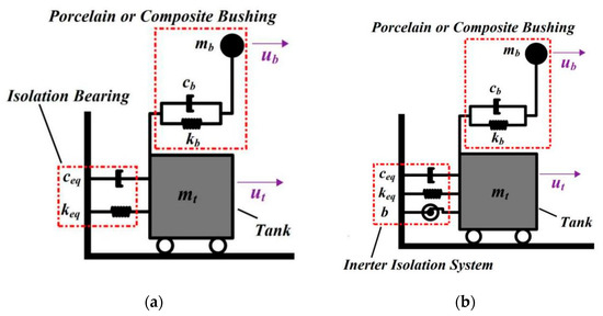 For traditional isolation systems [30,31], the isolation bearings, e.g., elastomeric [32] or wire rope isolators [33], are installed at the bottom of the transformer–bushing system. The mechanical model of the bearing can be simplified as the parallel connection of the stiffness element and damping element, which is called the isolation bearing (IB) in this paper. For the inerter isolation system, an additional inerter is added on the isolation bearings. Figure 3 shows the mechanical model of the transformer–bushing system with IIS and IB installed. Where mt, mb, and b are the mass of the tank, bushing, and the equivalent mass of inerter, respectively, ceq and cb are the damping coefficient of isolation bearing and bushing respectively, and keq and kb are the stiffness of isolation bearing and bushing, respectively.