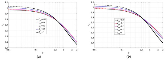 The relative displacement between the bushing and tank can directly reflect the seismic response level of the bushing, and it is also the most important index in the vibration control of the transformer–bushing system. Therefore, the relative displacement of the bushing should be taken as the primary control index, and the random vibration analysis of the transformer–bushing isolation system under white noise input should be carried out. First, the inerter–mass ratio μ is analyzed. When the inerter–mass ratio is fixed, the influence of inerter–mass ratio on the isolation layer can be seen directly. Figure 4 shows the relative displacement response ratio γU when changing the damping ratio ζeq with different types of bushing systems.