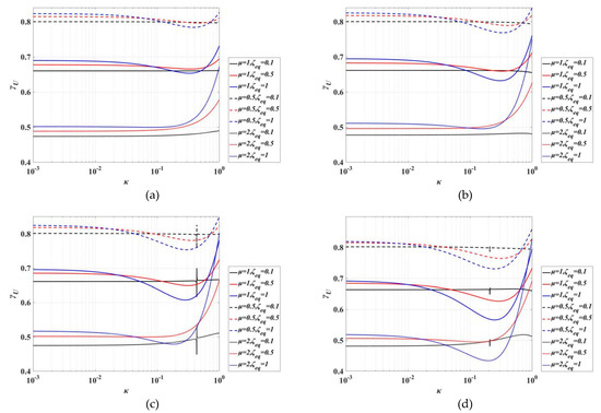 The base shear force ratio γSF is also an important index of the isolation system. We can use it to seek the trend of each parameter and compare it with the trend of displacement index to comprehensively select the final isolation layer parameters. Figure 10, Figure 11, Figure 12 and Figure 13 show the base shear force ratio of four types of transformer–bushing systems under different frequency ratios κ.