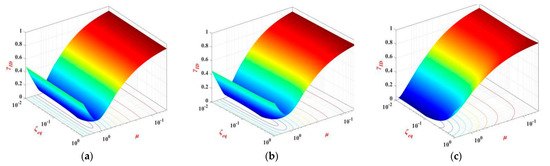 Parameter analysis of isolation layer select inerter–mass ratio μ, frequency ratio κ and damping ratio ζeq. The index of parameter analysis is the relative displacement response ratio of bushing γU, displacement ratio of isolation layer γID, and base shear force response ratio γSF. The parameter range of inerter–mass ratio μ in parameter analysis is [0.01,10], frequency ratio κ, and damping ratio ζeq is [0.01,1].