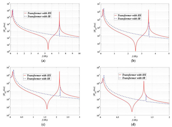 Figure 14 shows the displacement amplification factors of bushings corresponding to Table 2. It can be seen that the natural frequency of the isolation system bushing is reduced, and the displacement responses are also decreased. Compared with the IB system, the displacement amplification factor of IIS is lower, and the response of bushings with low frequency (LB–2) decreases the most. The natural period of the bushing with IIS is further extended, far away from the predominant period of ground motion. At the same time, as the isolation effect of IIS is more obvious, the bandwidth of bushing response after isolation also increases. Figure 15 shows four types of transformer–bushing systems corresponding to Table 2. Similar to the trend in Figure 14, compared with IB system, the amplitudes of transfer function of the base shear force of IIS are lower, and the shear force response of bushing with low frequency is reduced the most.