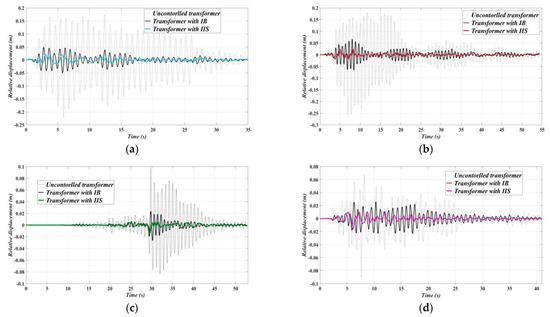El Centro wave, Taft wave, Chi Chi wave, and Kobe wave were selected as seismic waves; the predominant frequencies of the four seismic records were different. Figure 16 shows the acceleration response spectra of the four seismic waves. The higher the structural height and weight of the bushing, the higher the seismic vulnerability, and the difficulty of vibration control will increase. Therefore, this paper selects the LB–2 transformer–bushing system, which is the most vulnerable to earthquakes, as the analysis object for analyzing the dynamic time history under four kinds of ground motion inputs. Figure 17 shows the relative displacement time history of the bushing and the transformer, which can reflect the seismic response of the bushing itself; Figure 18 shows the hysteresis loops of the isolation layer, which can reflect the displacement response of the isolation layer and the energy dissipation capacity of dampers of IB and IIS.