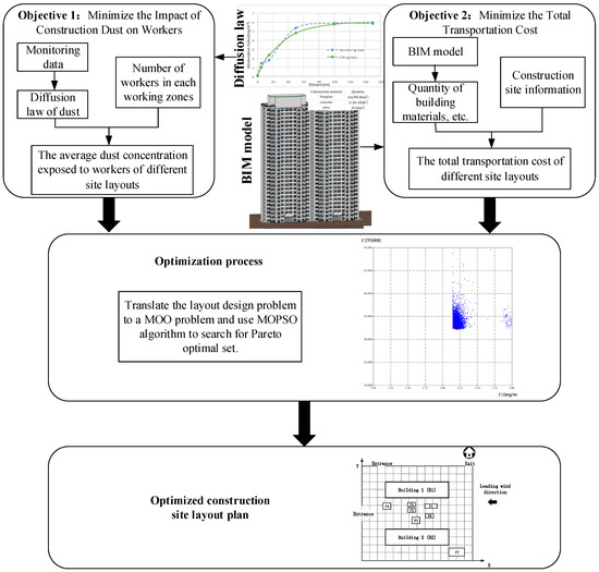 This study proposes a new method that uses a reasonable site layout plan to reduce the average dust concentration exposed to workers. This method allocates the facilities on sites according to the dust diffusion law and number of workers on each working zones. By increasing the distance between dust pollution sources and workers, this method can reduce the average dust concentration exposed to workers. Thus, the negative effect of construction dust could be reduced. However, the longer distance between facilities would increase the transportation cost on the site. Therefore, the multi-objective particle swarm optimization (MOPSO) algorithm is applied in this study to balance the construction dust negative effect and total transportation cost. In addition, the BIM model, due to its rich sources of building information, is also used in this study to automatically provide basic construction information [30], which can help site managers save much time and effort in designing the site layout plan in the pre-construction stage.