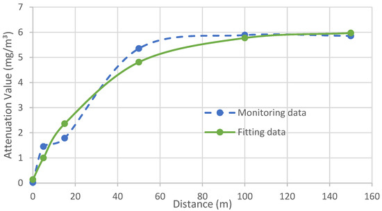 In Equation (2), is the concentration of the dust source ; is the construction dust concentration attenuation value. If the concentration of dust source is greater than the attenuation value , then is equal to the concentration of dust source minus attenuation value . If the concentration of dust source is less than the attenuation value , then the is equal to 0, i.e., in this situation, the dust source has no negative impact on the workplace . In Equation (3), is the distance between workplace and dust source in the leading wind direction. This equation is derived by fitting the monitoring data (Figure 2).