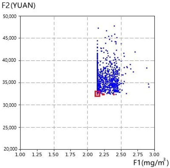 The optimized construction site layout plans could be generated by applying the proposed multi-objective construction site layout model and the MOPSO algorithm. Python was used to code the model and algorithm. After a few rounds of searching, the Pareto front and Pareto optimal set, which represents potential construction site layout plans, was generated. In Figure 4, the red dots represent the non-dominated solutions and the blue dots represent the non-optimal solutions. One characteristic of the non-dominated solution is that a gain in an objective from one solution to the other is only obtained by sacrificing at least one other objective [42]. Due to this characteristic, the site managers need to choose the most suitable solution according to the practical situation of the construction project. In this case, the site managers pay lots of attention to the health of construction workers. Therefore, the red dots on the left are more likely to be selected by managers. However, the total transportation cost of the leftmost red dot is particularly high, compared with other dots in Pareto front. Finally, the dot enclosed by the red box is selected as the final optimization solution. The optimized construction site layout plan is shown in Figure 5.
