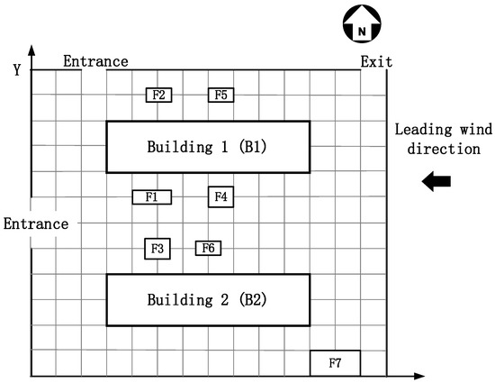 In Equation (1), is the construction dust concentration at workers’ workplace , where ; represents the construction dust concentration at workers’ workplace originating from the dust source , which can be derived from Equation (2); is the background construction dust concentration. Due to the up–down wind direction method [20], the upwind point concentration is taken as .