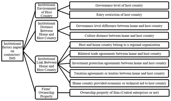 - The results show that 7 of the 10 institutional factors have a significant impact on Chinese contractors’ IMS. These factors cover all four categories in the empirical research, which manifests that the IMS of contractors is affected by institutions from different levels. It is necessary to consider institutional factors comprehensively in IMS decision-making research and practice.