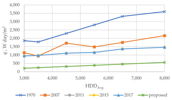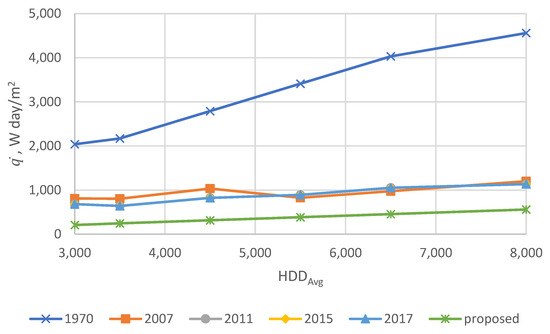 In which U and HDDAvg are the conductance (W/m2 K) and average heating degree days corresponding to the climate zone, respectively. HDD for Canadian climate are given in Table 7. The results, plotted in Figure 1, Figure 2, Figure 3 and Figure 4, corresponding to wall, roof, ground floor and window, respectively, reveal that (a) the heating energy is designed to increase with HDD, (b) the heat transfer rate differs for the different building envelope systems, and (c) the requirements which are incremental hardly changed for the past 10 years. Accordingly, and focusing solely on the building envelope, NECB requirements are designed to accept higher heating energy with increased HDD, which is counter intuitive from an economic and ecological perspective. Moreover, NECB assesses improvements through comparison with the preceding thermal resistance requirements. This methodology, which is adopted by most, if not all, codes. However, although it is sound mathematically, it is misleading as it measures improvements with the worst case and not the best or perfect case and is deterrent to technology development, as the potential energy savings are never realized. As such, a consistent and comprehensive metric for measuring the energy performance of the building envelope is needed.