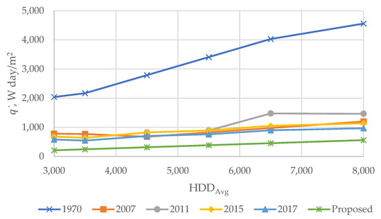 Buildings’ energy consumption depends on the climate, orientation, size, occupants, building envelope specifications, HVAC system specifications, lighting specifications, available controls and equipment, etc. [7]. Regulating buildings’ energy efficiencies in codes and standards, which is increasingly being sought, [8,9], is starting to be recognized as one of the most cost-effective tools for achieving energy efficiency in buildings. In 2017, the Building Code of British Columbia (BCBC) prescribed the highest level of performance as annual net zero energy (NZE) consumption during occupancy [10]. Towards this objective, thermal energy demand intensity (TEDI) and mechanical energy use intensity (MEUI) are utilized to regulate the energy efficiency of buildings [10]. An examination of the premise of these two metrics reveals that TEDI and MEUI are not compatible and that only MEUI has been standardized. The MEUI includes absolute measures of efficiency, whereas the TEDI includes relative measures of thermal performance being climate condition and building archetype. Accordingly, building envelope energy efficiency as an absolute measure is missing.