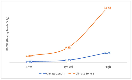 Closer examination of the BECOP values reveals that the metric captures the coupled effect of the thermal resistance, Climate Zone, and internal heat gains. With the latter being constant, as the HDD increases, the impact of an efficient building envelope is captured and reflected with an increase in BECOP value. Moreover, the significance is most visible for the high-performance construction, where the BECOP value goes from less than 1% to 33%. If the values are compared across the levels of construction, a clear upward trend is observed from Figure 5. For Zone 8, the impact of the building envelope properties on the BECOP is significant, with the value increasing exponentially to 33%.