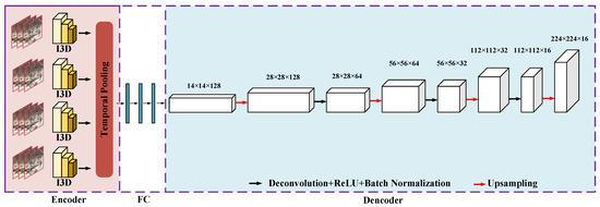 The first term of the objective function is the loss function, which was used to calculate the difference between the reconstructed frame and the video frame, and the second phase of the objective function is the L2 regularization, which was used to limit the complexity of the parameters in the autoencoder. In the encoder part, to reduce the model parameters, we read 64 frames of grayscale video instead of RGB video and used four I3D modules as feature extractors; the features extracted by the I3Ds were pooled in time and then entered into the fully connected layer. In the decoder part, we used four upsampling layers and three deconvolution layers, each of which contains a ReLU layer.