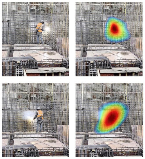 Grad-CAM++ is based on CAM [34] and Grad-CAM [35], the principle of which is to construct the weights of the action maps, and by solving for the weights, the contribution of different action maps to the reduction in the objective function is obtained; furthermore, by multiplying weights with the action maps, the heat maps are obtained to show which area contribute most to the reduction in the objective function. In our task, we needed to find out which areas contributed most to the increase in reconstruction error, which were the locations of irregular construction in the construction scenarios. The calculation formula for the abnormal location is as follows: