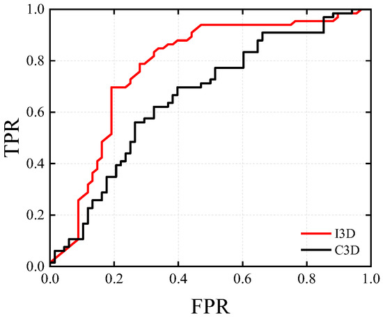 As seen in Figure 7, the ROC curves of the proposed method are fuller than those of the C3D-based method, indicating that the proposed method outperformed the C3D-based method in locating anomalous areas. The reason for this is that the C3D-based method is weaker than I3D in video feature extraction, and I3D has the advantage of pretraining; therefore, it can capture more details in the video through multiple I3D modules in series, making it a stable and fast video feature extraction method.