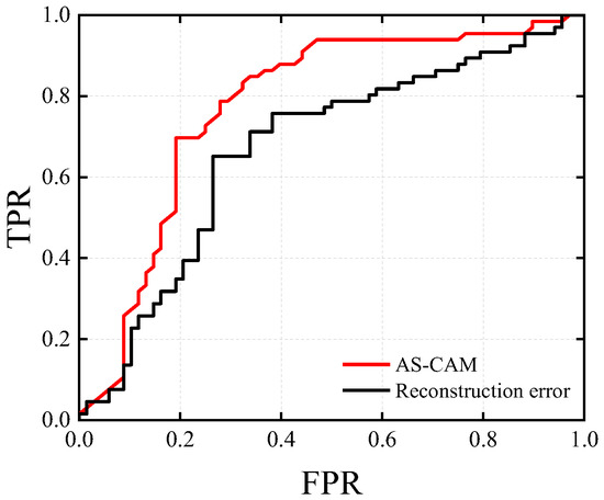 From Figure 8, it can be seen that AS-CAM has a better localization effect based on the area surrounded by curves and axes, and the reconstruction error-based method has a larger gap than the proposed method. The reason is that, in video prediction, although a reconstruction error can represent an anomalous area, it is also affected by network depth—when the network layers are deep, the anomalous pixel area causes the error not necessarily in the mapped anomalous area; therefore, this type of method is more suitable for shallow encoder networks.