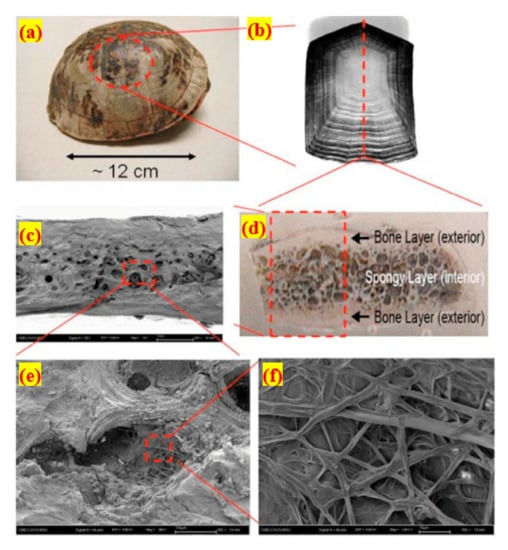 - Balani, K.; Patel, R.R.; Keshri, A.K.; Lahiri, D.; Agarwal, A. Multi-scale hierarchy of Chelydra serpentina: Microstructure and mechanical properties of turtle shell. J. Mech. Behav. Biomed. Mater. 2011, 4, 1440–1451. [Google Scholar] [CrossRef] [PubMed]