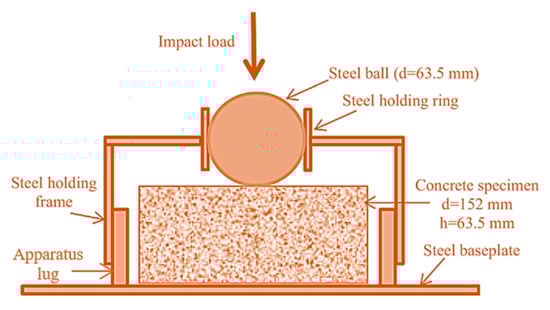 Concrete structures are often subjected to with various stresses []. Regarding these sorts of loads, impact loads have a low likelihood of occurring within the life span of a building []. However, in the last several decades, the necessity of impact analysis has risen due to terrorist operations. Impact loads can be created by falling rocks hitting insurance exhibits, airplane and missile impacts on nuclear containments, vehicle accidents, ice or ships’ wrecks, or dropped items striking on industrial and nuclear plants due to handling activities. Even if composite materials’ mechanical and durability qualities have been improved, there is a need to assess the material’s resistance to impact loading since this is an essential quality for building materials.