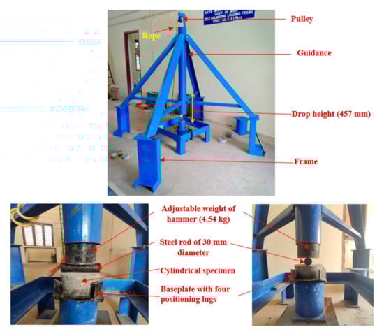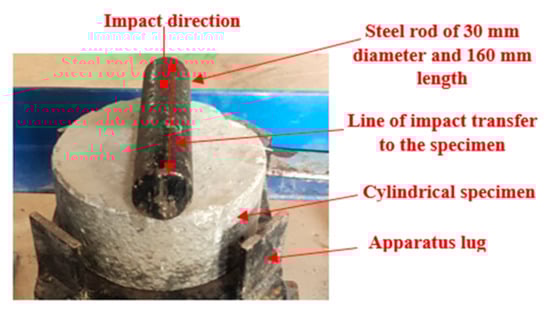 Literature revealed many sources of error in the existing ACI drop-weight test []. This research considers the primary two sources of error, and modifications are suggested accordingly. At first, the probability of inaccurate results is higher at the single spot of impact, which causes a localized impact on the small area of the material. Second, cracks occur anywhere on the specimen’s top surface, resulting in increased test subjectivity. The modification suggested here introduces the line of impact using a 30 mm diameter steel bar placed horizontally on the specimen, as shown in Figure 3. The steel hammer is free-fallen onto the steel bar, and the impact load is dissipated to more area instead of to a single spot. This modification allows cracks to occur parallel to the line of impact and splits the specimens into two pieces together with multiple cracks in a radial direction. This modification predefines the crack path and specimen failure, resulting in a reduction in result scattering.