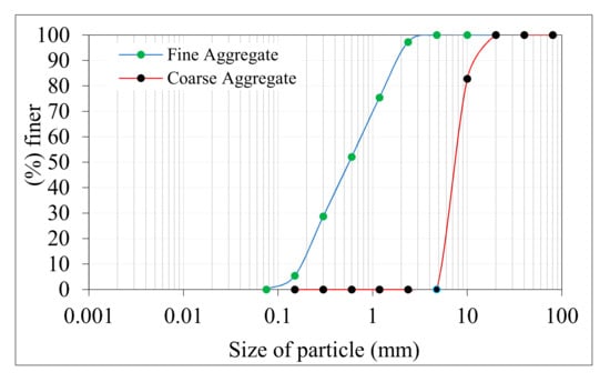 - Pozzolana Portland general-purpose cement was used in the experiments, which meets IS: 1489-2015 []. The cement has a specific gravity of 3.09 and a specific surface area of 318 kg/m2. Normal river sand was used as fine aggregate. In addition, the fineness modulus, water absorption, and specific gravity of the used fine aggregate were 2.41%, 1.15%, and 2.65%, respectively. The granulometric curve of the adopted sand is consistent with Zone II per IS: 383-2016 [], with particle size of no more than 2.36 mm to ensure excellent flowable grout mixture in line with ASTM C939/C939M-16a []. As a result, a flowable grout was obtained to fill voids entirely and effectively. Crushed granite gravel with a normal density and a 12.5 mm maximum size was used as coarse aggregate with a water absorption and specific gravity of 0.59% and 2.69 respectively. The granulometric curve for the fine and coarse aggregates used in this experiment is illustrated in Figure 4. The flowable grout was made using a premium high-range water reducer (Tec Mix 640) with a density of 1.08 0.01 at 25 °C and a pH value of 7–9. Different dosages (0.3% to 0.5% by cement weight) were used to produce the grout for nonfibrous and fibrous specimens. Fiber is now a part of concrete reinforcement as it has many benefits for concrete. A 1 mm diameter and a 50 mm length of hybrid hooked-end crimped fiber was used, which had a tensile strength of 1200 MPa and was made using a novel geometrically shaped steel fiber (SF) and macro polypropylene fiber (PF). The PF had a tensile strength of 500 MPa and measured 45 mm in length with a diameter of 0.8 mm. Figure 5 demonstrates the SF and PF appearance.