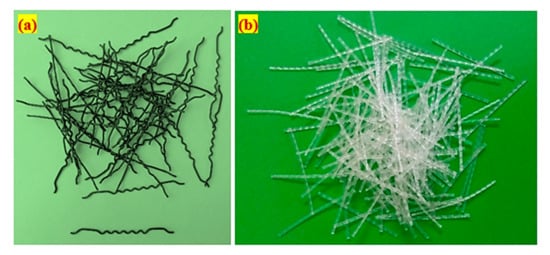 Figure 5. Fiber appearance: (a) hybrid shape of hooked-end crimped and (b) macro polypropylene fiber.