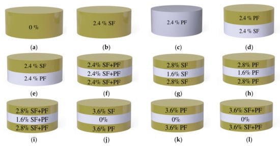 Details of fiber content used in the layers. (a) PAC, (b) S-SF, (c) S-PF, (d) D-SF-PF, (e) D-PF-SF, (f) T-FG1, (g) T-FG2, (h) T-FG3, (i) T-FG4, (j) T-FG5, (k) T-FG6, (l) T-FG7.