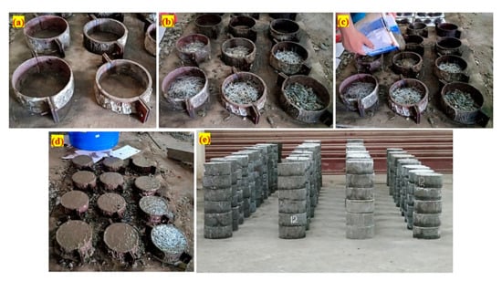 One hundred eighty cylindrical specimens were prepared with a count of 15 per mixture. Impact strength was assessed using 152 mm diameter and 64 mm high cylindrical specimens. The stage-by-stage method of FPAFC casting comprises three key processes, as shown in Figure 7. First, the oil was applied to all internal surfaces of an empty cylindrical mold after it was placed on a level surface, as shown in Figure 7a. Second, a natural skeleton was created by first combining aggregates and fibers, and then packing them into an empty mold, as shown in Figure 7b. A cement grout was applied to the skeleton’s surface and allowed to fill the spaces while gravity took its course. Figure 7c shows the grout filled in all the spaces after a compaction was applied using a 6 mm diameter tamping steel rod. This compaction eradicates honeycombing. Figure 7d depicts the appearance of specimens after they were grouted. Figure 7e shows the looks of all of the specimens after they were demolded for 24 h. The three layers of FPAFC were produced one by one. The coarse aggregate and fibers were filled up to the level of first layer (61 mm height), followed by grout injection. The second (22 mm height) and third layers (61 mm height) were cast immediately (within 10 min) after the completion of the first layer. The same casting technic was adopted to complete the second and third layers. The specimens that were retrieved from the mold were allowed a 28-day curing process in water immersion before being tested.