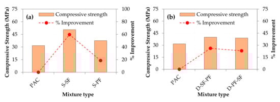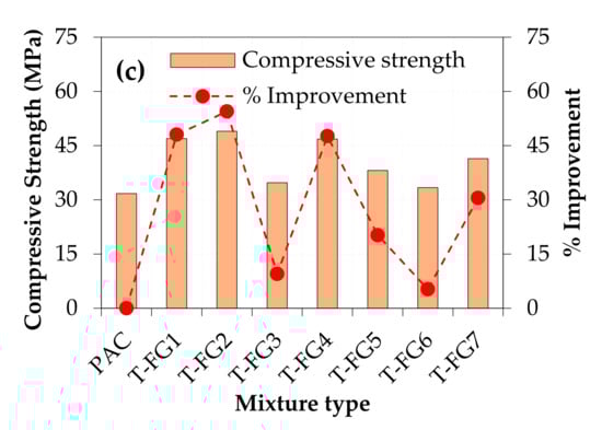 - The highest compressive strength was exhibited by the S-SF specimen, which showed 59.6% enhancement compared with PAC. The second highest compressive strength with 54.4% improvement was recorded for the T-FG2 specimen, which comprised 2.8% SF at the top and bottom layers and 1.6% at the middle layer. Thus, the performance of single-layered concrete was superior to that of three-layered FPAFC under compression.
