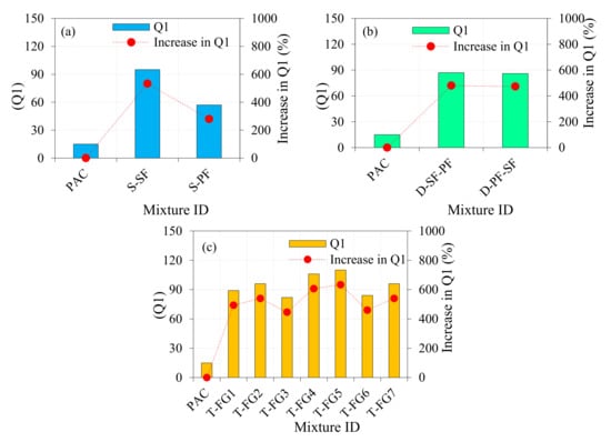 - For the S-SF and S-PF specimens, the recorded Q1 increased by about 533% and 280%, respectively. Likewise, the recorded Q2 increased by about 1980% and 440% compared with PAC. The percentage increases in Q1 for the mixtures D-SF-PF and D-PF-SF were 480% and 473%, respectively, while those in Q2 were 1100% and 1505%, respectively. The presence of well-distributed fiber-reinforcing elements crosses the created cracks and shared significant amounts of tensile stresses that try to open the cracks due to the fiber’s high tensile strength, which slows the opening of initiated cracks, resulting in higher impact energy absorptivity.