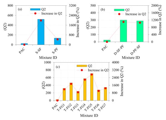 The third group of specimens included three subgroups that differ in the distribution of fiber content in each of the three layers. T-FG1 represents the first subgroup, which was also the reference for the two other subgroups, where all three layers incorporate the same fiber content of 2.4%, which is a mix of 1.2% SF and 1.2% PF. Fiber content was increased gradually in the following two subgroups in the top and bottom layers and decreased in the middle layer, as detailed in Figure 6 and Table 2, keeping the same average fiber content of 2.4%. Two points can be discussed in this group: the first is the type of fiber, and the second the fiber content in different layers. As shown in Figure 10c and Figure 11c, all fibrous T-FG specimens retained distinguishably higher Q1 and Q2 records compared with the reference specimens’ PAC, which was anticipated due to the matrix reinforcing action of the fibers.