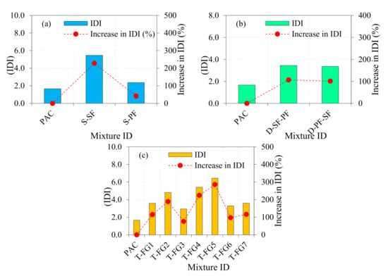 Comparison between IDIs of the triple-layer mixtures is depicted in Figure 12c, where it is obvious that the ductility of all triple-layer mixtures (T-FG1-T-FG7) was apparently higher than that of the reference mixture PAC. The IDI values of T-FG1, T-FG2, T-FG3, T-FG4, T-FG5, T-FG6, and T-FG7 were 3.58, 4.81, 2.94, 5.41, 6.44, 3.30, and 3.60, respectively, while the IDI of PAC was 1.67. This meant that the percentage increase in the IDI of the T-FG specimens compared with PAC was in the range of approximately 76% to 286%, which reflected the positive influence of fibers on the postcracking impact performance of the specimens. Evaluating the effect of fiber type and fiber distribution by comparing the three subgroups of the triple-layer group, the same conclusions are drawn for the Q1 and Q2 records. The first conclusion is that the PF specimens exhibited the lowest IDI for both the 2.8% and 3.6% top and bottom layers’ fiber contents, while the hybrid specimens exhibited higher IDI for the second subgroup (2.8%, 1.6%, 2.8%), while the SF specimens exhibited the highest ever IDI for the third subgroup (3.6%, 0%, 3.6%). This behavior was due to the superiority of steel fibers in terms of bond and strength compared with the adopted type of polypropylene fiber. It can also be recorded that in most cases, increasing the fiber content in the top and bottom layers and decreasing it in the middle layer led to higher ductility, which was noticed by comparing the SF specimens T-FG2 and T-FG5 in addition to the PF specimens T-FG3 and T-FG6, as shown in Figure 12c. All FPAFC specimens exhibited different IDI values due to the various dosages of fibers used at the top layer, which can experience the point of impact. The amount of fiber presence at the point of impact can show a different postcrack resistance, which indicates different IDIs.