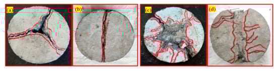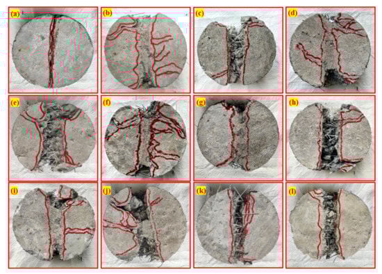 The adequacy of the introduced modification (line rod) to control the cracking path is also obvious for the fibrous specimens, as shown in Figure 13b–i. However, this behavior is associated with some lateral cracks or end fracture zones, caused by the presence of fibers and their reinforcing action, where fibers have the ability to redirect tensile stresses on different paths by crack bridging, thereby affording stress relief for the concrete matrix. Comparing these specimens, it is obvious that specimens reinforced with PF (S-PF, T-FG3, and T-FG6) failed due to the lack of a bond between fibers and the matrix (Figure 13c,h,k). This behavior was also recorded for the double-layered specimen with the top layer being reinforced with PF, as shown in Figure 13e, while such behavior was not recorded in the SF specimens. The main reason for this behavior was the weak bond between PF and the matrix due to the straight shape and smooth surface, as shown in Figure 5. Consequently, the bond along the fiber length and the anchorage at its ends were lower than the applied tensile stresses across the bridged cracks, resulting in fiber pullout from the matrix [].