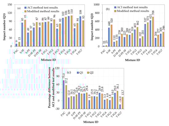 A comparative analysis of modified test results from the current study with the test finding obtained from the previous study with the ACI method [] for the same mixtures with exactly the same fiber dosages and schemes is shown in Figure 15. Impact test results from the modified impact were significantly higher in Q1 and Q2 than in the ACI method, as shown in Figure 15a,b. This trend was the same for all mixtures, irrespective of the concrete layer. The percentage difference in results between these two methods ranged from −14% to 75% for Q1 and from 6.8% to 57.2% for Q2, as shown in Figure 15c. These results were attributable to specimens being exposed to a single force that had a localized influence on the specimens’ small size and so had lower Q1 and Q2 values. As a result of applying this single-point impact, the impact energy will be focused on just a small area of a small cylindrical specimen. Radial cracking occurs as a result of this process and propagates further under multiple impacts, leading to quick failure. On the other side, all FPAFC specimens from the modified impact test exhibited higher impact strength values. The phenomenon was because the impact load was dissipated over a larger area by providing the steel bar horizontally on the top specimen’s surface and repeatedly subjecting the drop-weight impact. As a result, the modified test method eradicated the single-point impact load on a soft area or hard area, or on the fibers. Hence, failure of the specimens did not happen quickly due to the application of the line impact load that was dissipated over a broad area.